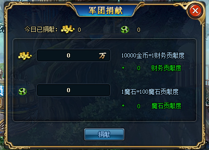 军团成员可以在军团在捐献金币或者魔石,玩家可以获得财务贡献度或者魔石贡献度,用于提升玩家的军团贡献度;军团可以获得军团金币和军团魔石。