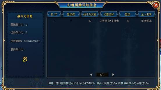 玩家还可以详细查看每一根图腾柱的详细信息,上面记录了幻兽的星级榜排名、排名战斗力奖励、幻兽名称、星级、主人名字,以及图腾柱的战斗力信息。