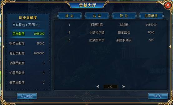 在贡献大厅内玩家可以查询军团成员获得总贡献度,也可以查询玩家自身财务贡献度、魔石贡献度、功勋贡献度、幻兽贡献度、鲜花贡献度等。