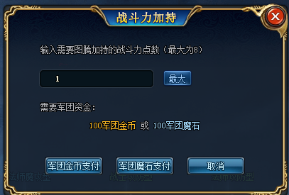 军团长还可以消耗军团金币或者军团魔石对图腾柱进行战斗力加持,提高图腾战斗力,以提高可分享的军团战斗力。每根图腾战斗力加持最高不超过8点,每根图腾柱的加持时间为30天。