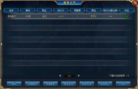 成员大厅内记录着军团成员的信息、在线状态等。点击成员名字还可以执行更多如聊天、添加好友等操作。在成员大厅内,玩家还可以进行禅让、任命副团长、申请官职、册封亲信、辞退亲信、辞去职位、开除等操作。