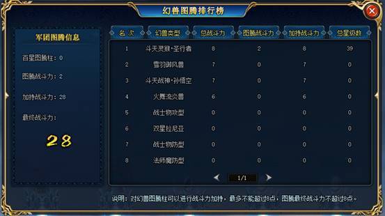 我们还可以查看总的幻兽图腾排行榜,这上面记录着军团内所有开启的图腾,玩家可以清晰的在上面看到每根图腾的战斗力加持信息。军团图腾内战斗力加成最高的前8根图腾柱的战斗力总和,就是玩家所在军团可以给成员分享战斗力的最大值。