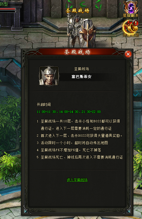 圣殿战场,每天晚上9点半到10点可以参加,圣殿战场带来的收益应该是目前所有活动当中最高的,但是难度也是最高的。进入圣殿战场的每一层都会有BOSS和小怪,我们主要目的就是通过击杀他们获取奖励。BOSS身上必然会掉落下一层的门票,而小怪身上也有一定的几率掉落下一层的门票。我们进入每一层应该做的就是直奔BOSS,毕竟好东西都在BOSS身上,有可能获取高端装备和一些稀有的道具,其实大家经常在游戏中因为强BOSS发生争斗,所以一般都是以小组为单位进行活动,这个组不能太大,因为一层没有那么多门票,一般三人组比较合适,大家一起抢BOSS,非常容易,而且击杀小怪速度也比较快,在圣殿战场前几层中,谁能够快速的下层才是王道,毕竟下层门票数量有限,越往下层走,我们的竞争也就越小,而且下层的BOSS也越强大,而且这个活动,每通过一层系统都能够带来大量的奖励,活动开启两小时,谁能够坚持到最后,谁肯定就是最后的玩家,这个地图当中PK是重头戏,大家为了门票大打出手,这个地图不红名,所以不要谦让,该出手时就出手,不要怂,就是干。